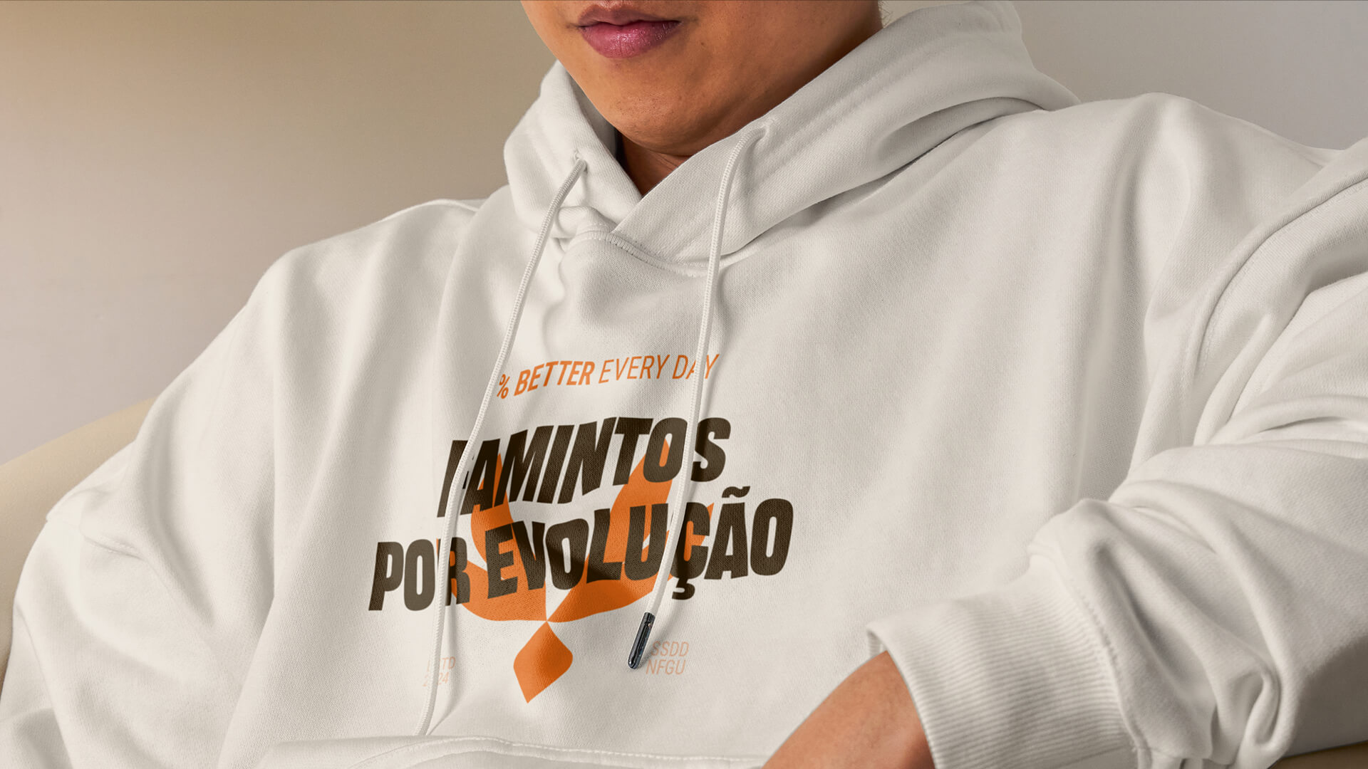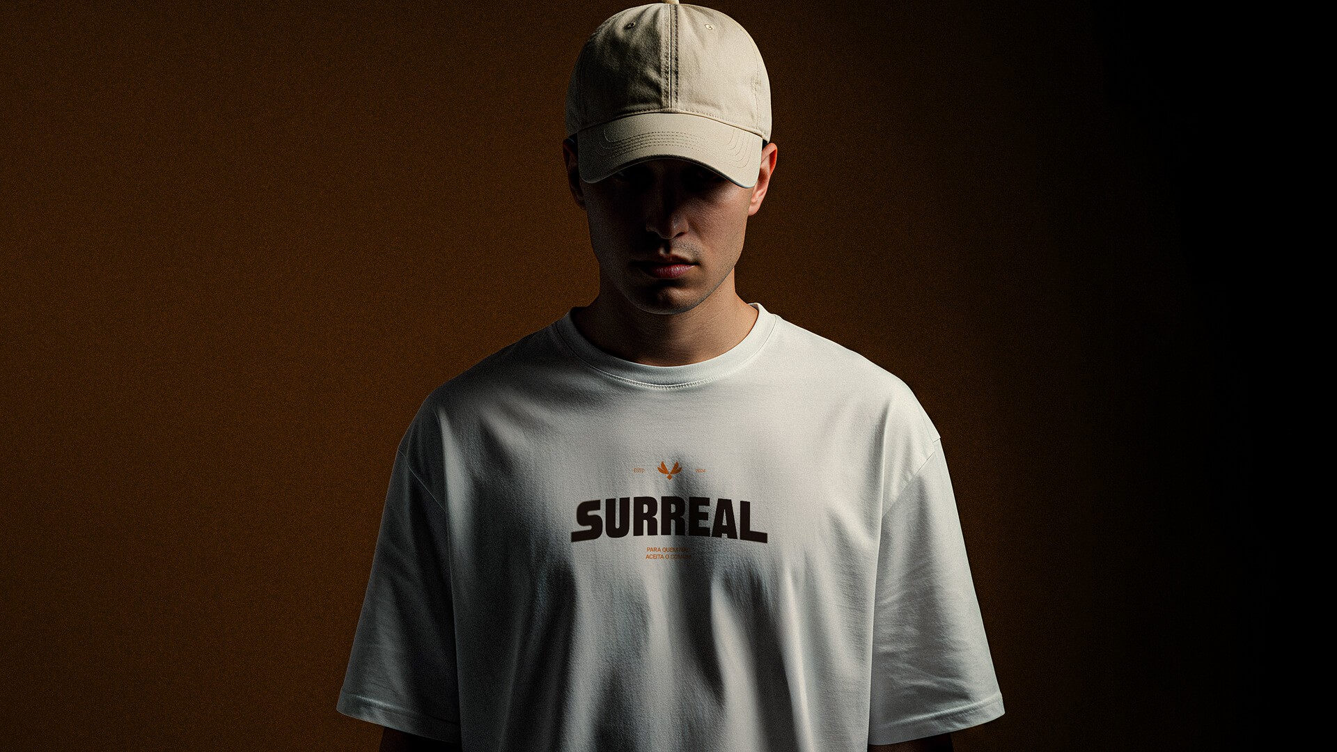 A revolução começa pela paleta de cores, onde substituímos o comum azul e preto por uma combinação ousada de off-white, que sutilmente referencia o produto, com laranjas vibrantes que transitam até tons mais profundos. Esta escolha cromática cria um equilíbrio único entre ousadia e acessibilidade.